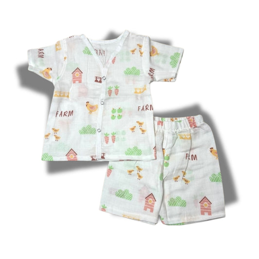 Baby Unisex Organic Cotton Muslin Half Sleeves Jhabla & Payjama Set - Size 6m-9m-Farm Print
