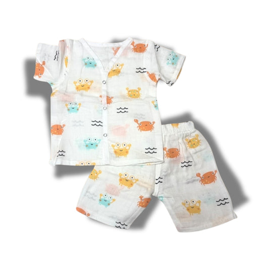 Baby Unisex Organic Cotton Muslin Half Sleeves Jhabla & Payjama Set - Size 6m-9m-Crab Print