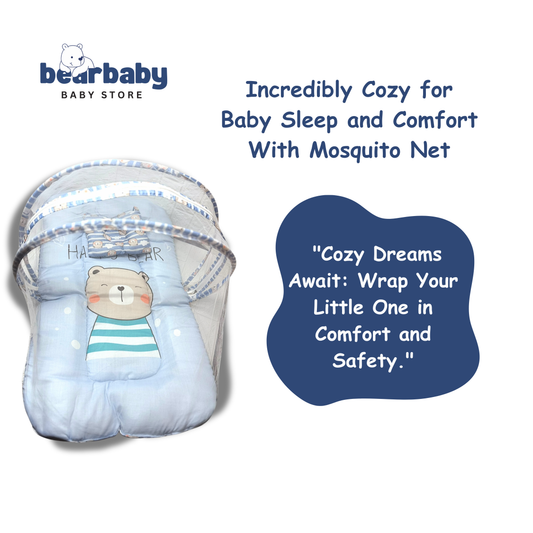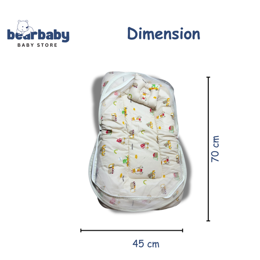 Baby Bed with Thick Mattress & Mosquito Net & Neck Pillowwith Zip Closure-Happy Bear
