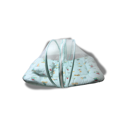 BearBaby Premium Baby Cotton Mattress Sleeping Bag with Mosquito Net & Free Pillow | Soft, Foldable Newborn Bedding Set (0–12 Months) LIGHT NEVY