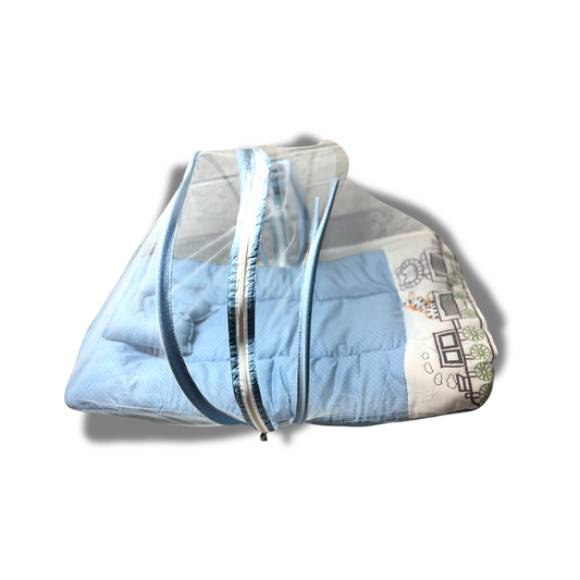 BearBaby Premium Baby Cotton Mattress Sleeping Bag with Mosquito Net & Free Pillow | Soft, Foldable Newborn Bedding Set (0–12 Months) BLUE