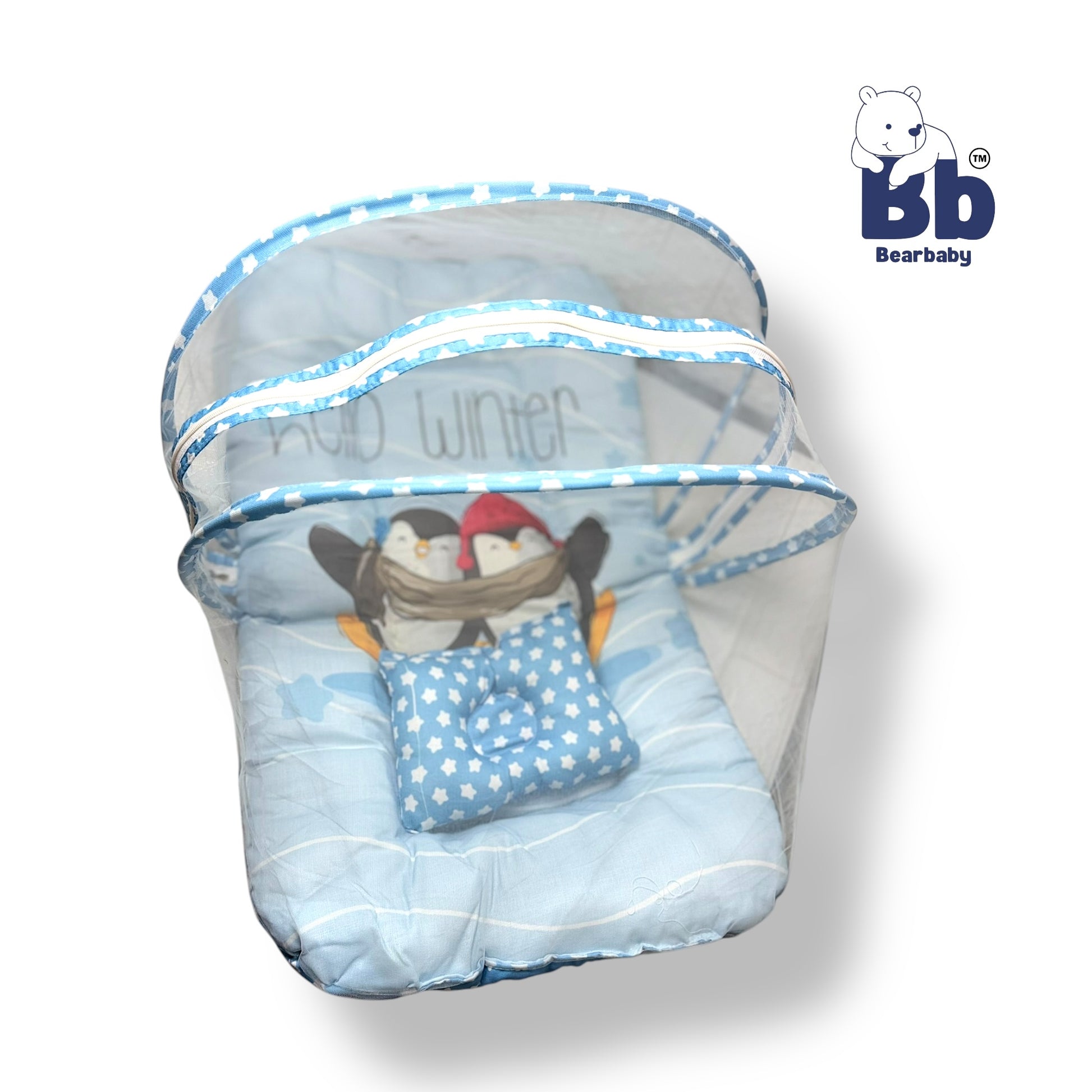 Baby Bed with Thick Mattress & Mosquito Net & Neck Pillow with Zip Closure-Penguin Hello Winter