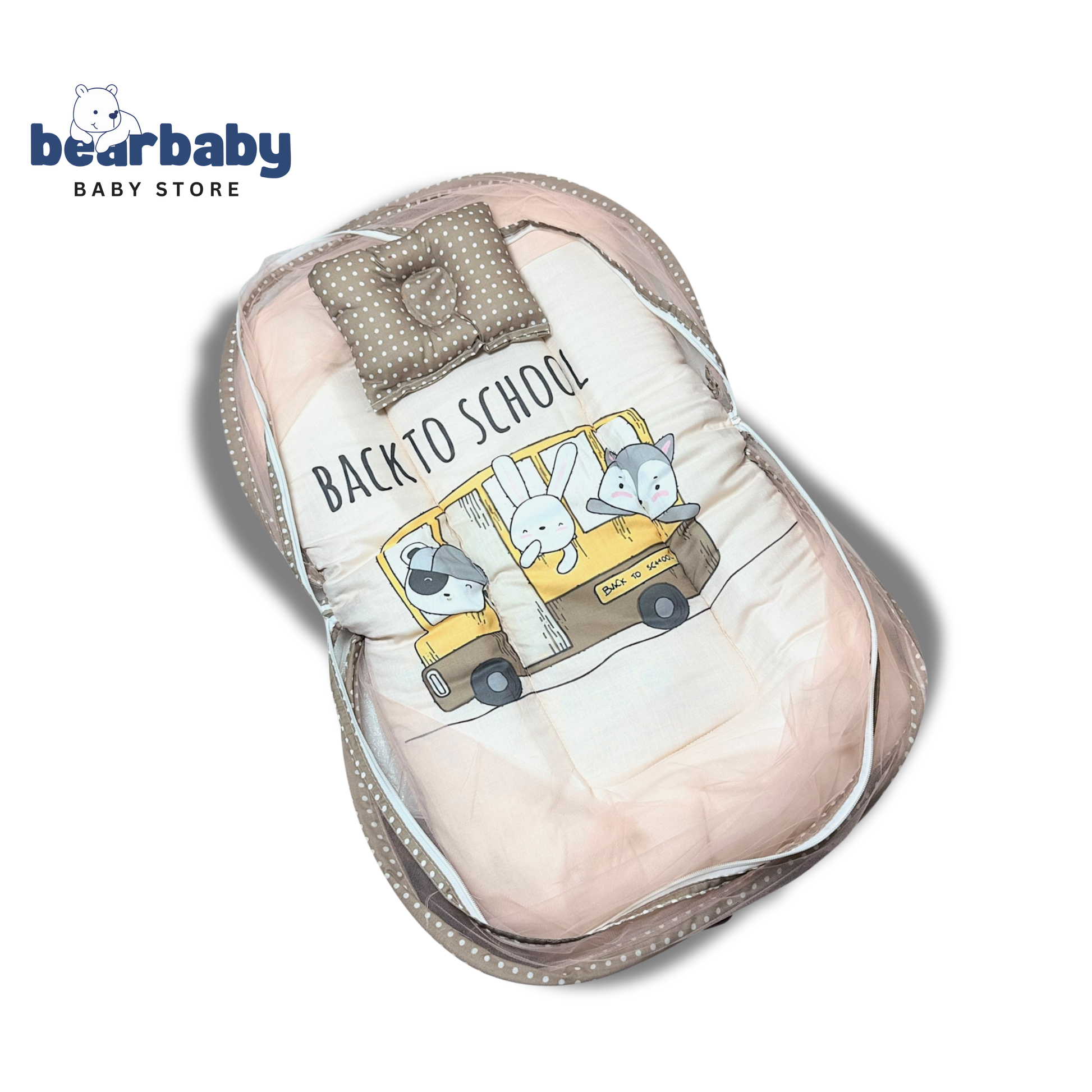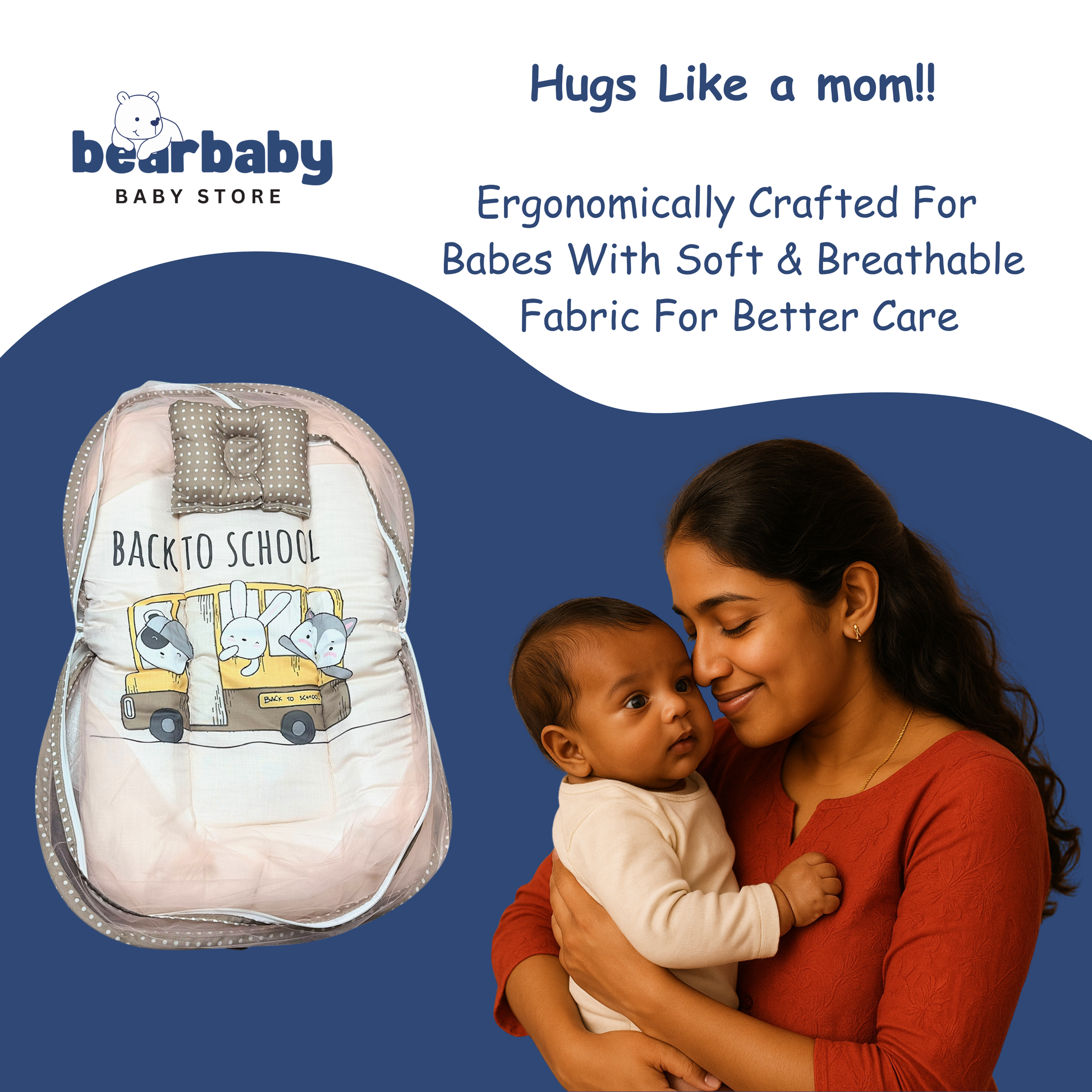 Ensure comfort and safety for your little one with this premium baby bed, designed with a thick mattress for extra support. The zippered mosquito net provides protection from insects, while the neck pillow ensures proper head support for newborns.