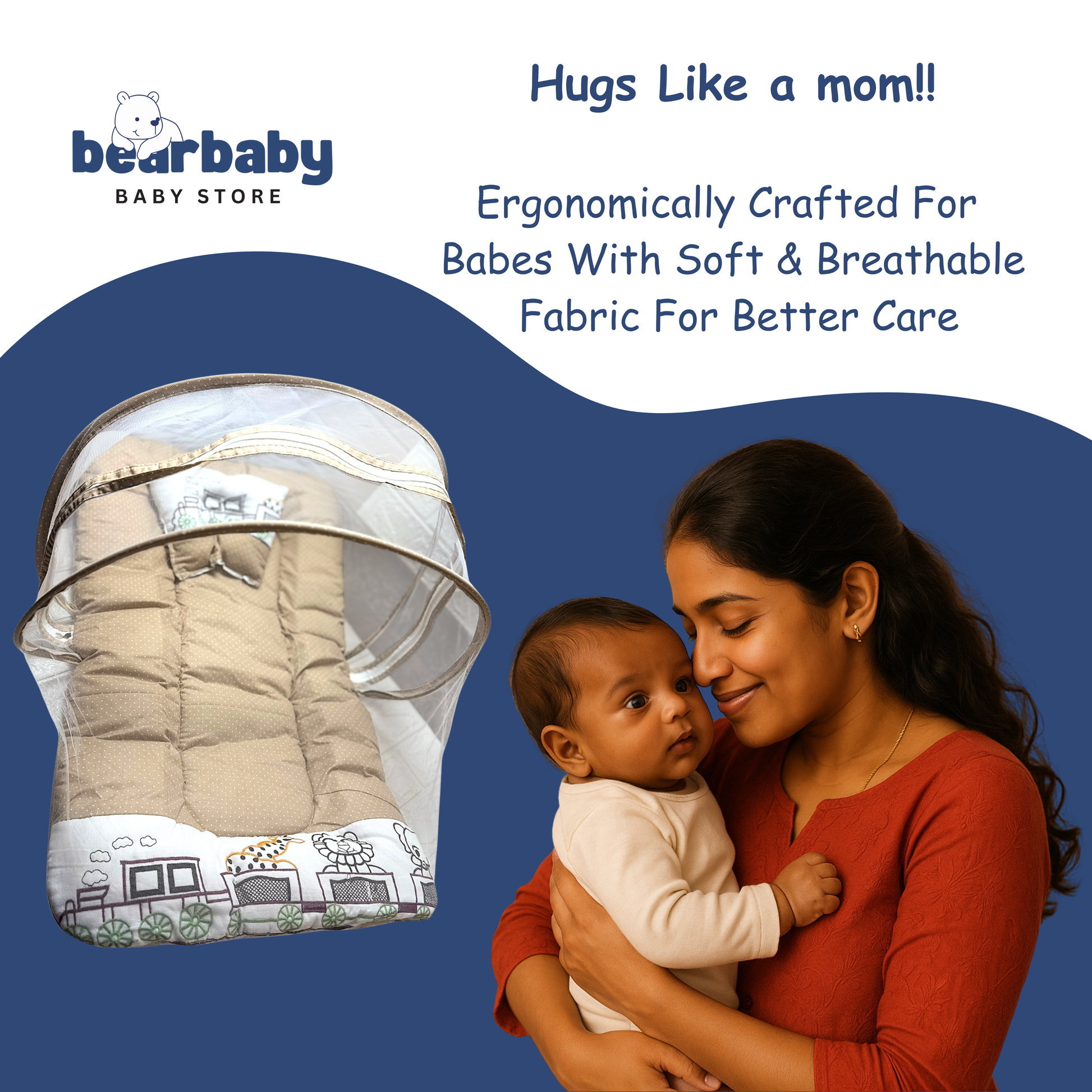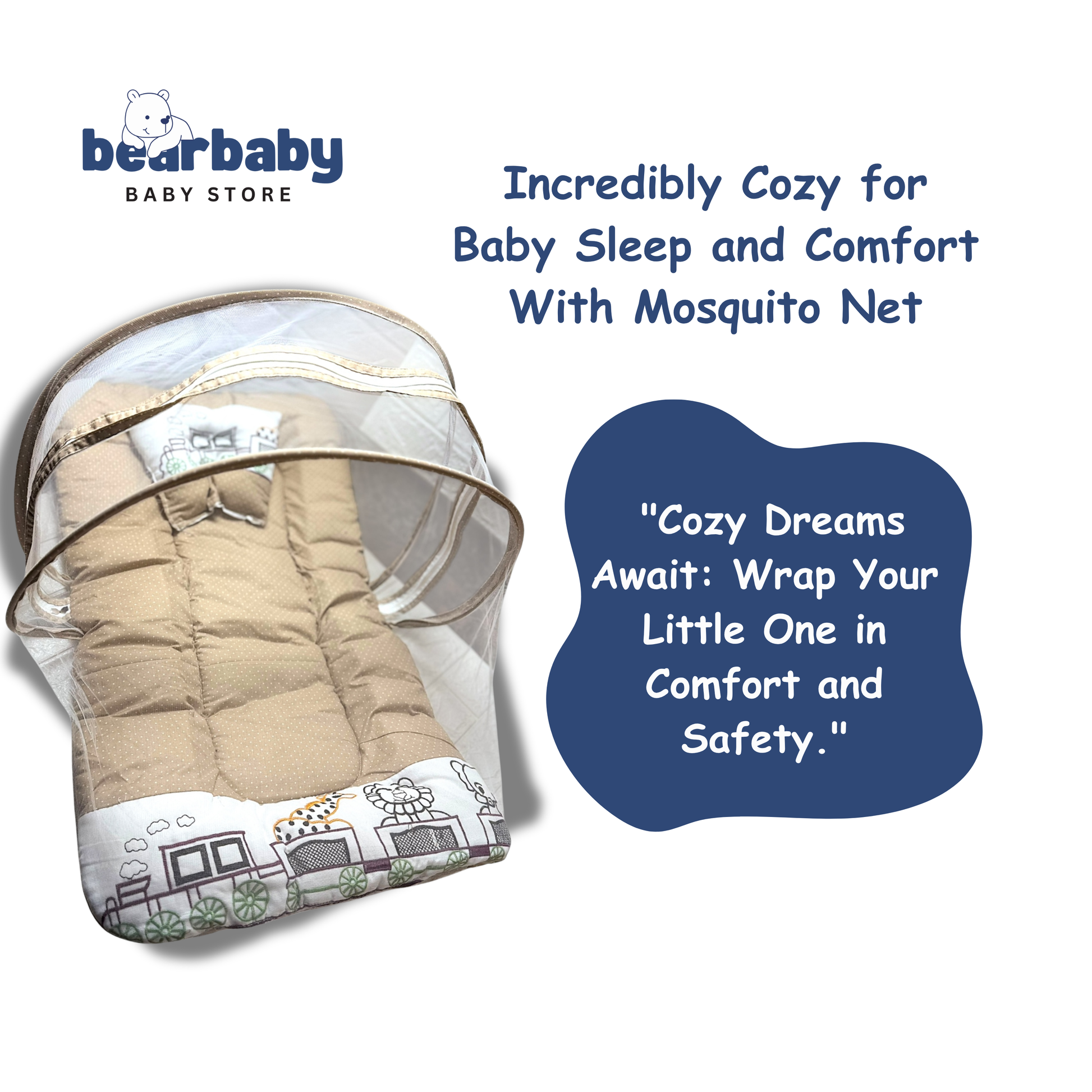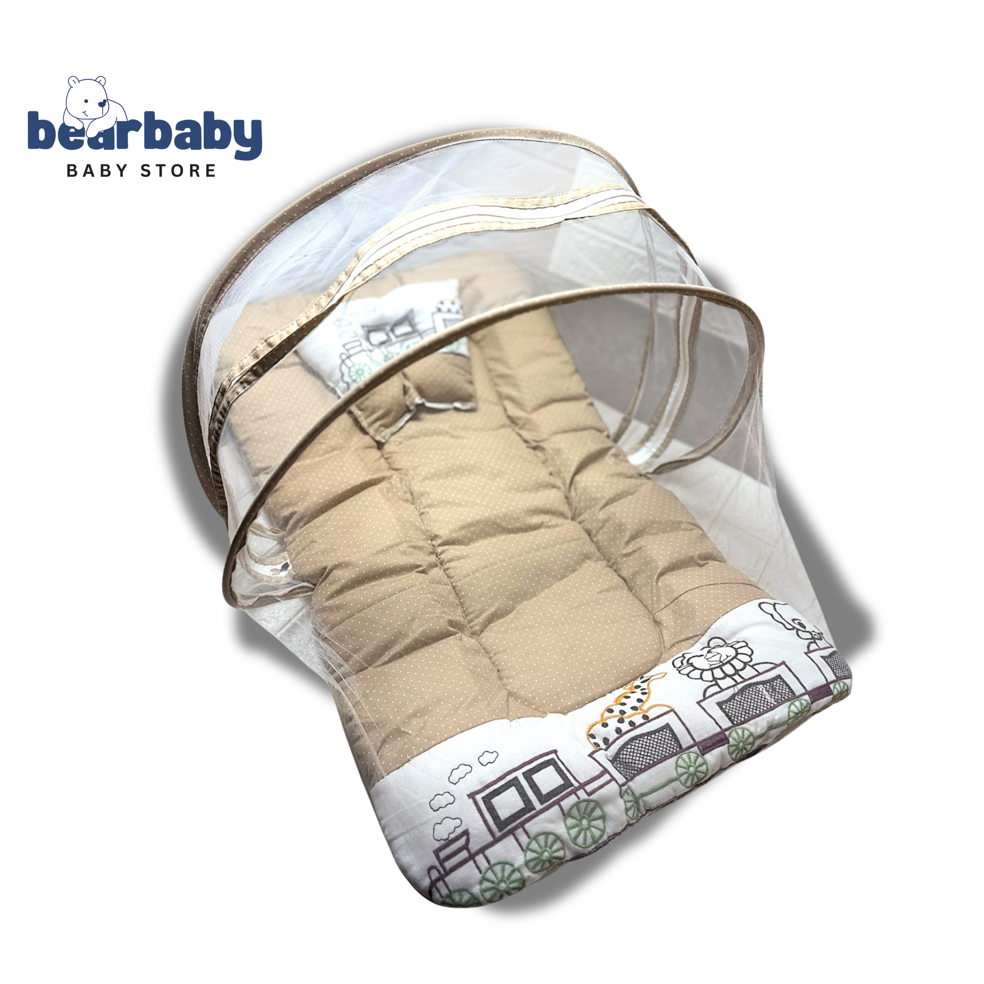BearBaby Premium Baby Cotton Mattress Sleeping Bag with Mosquito Net & Free Pillow | Soft, Foldable Newborn Bedding Set (0–12 Months) CREAM