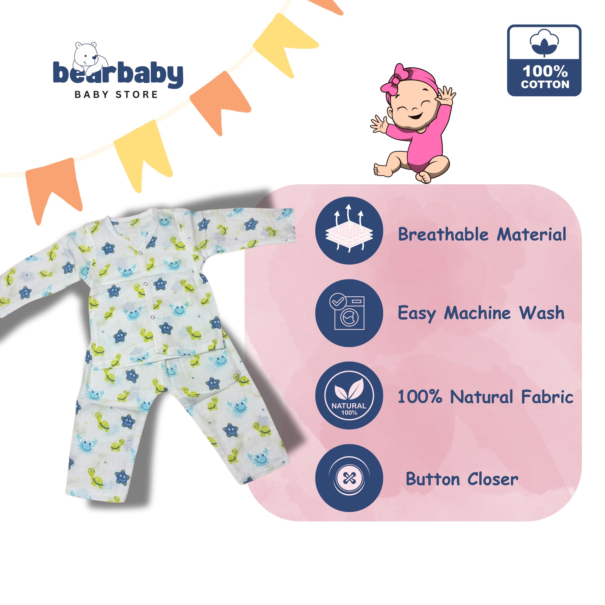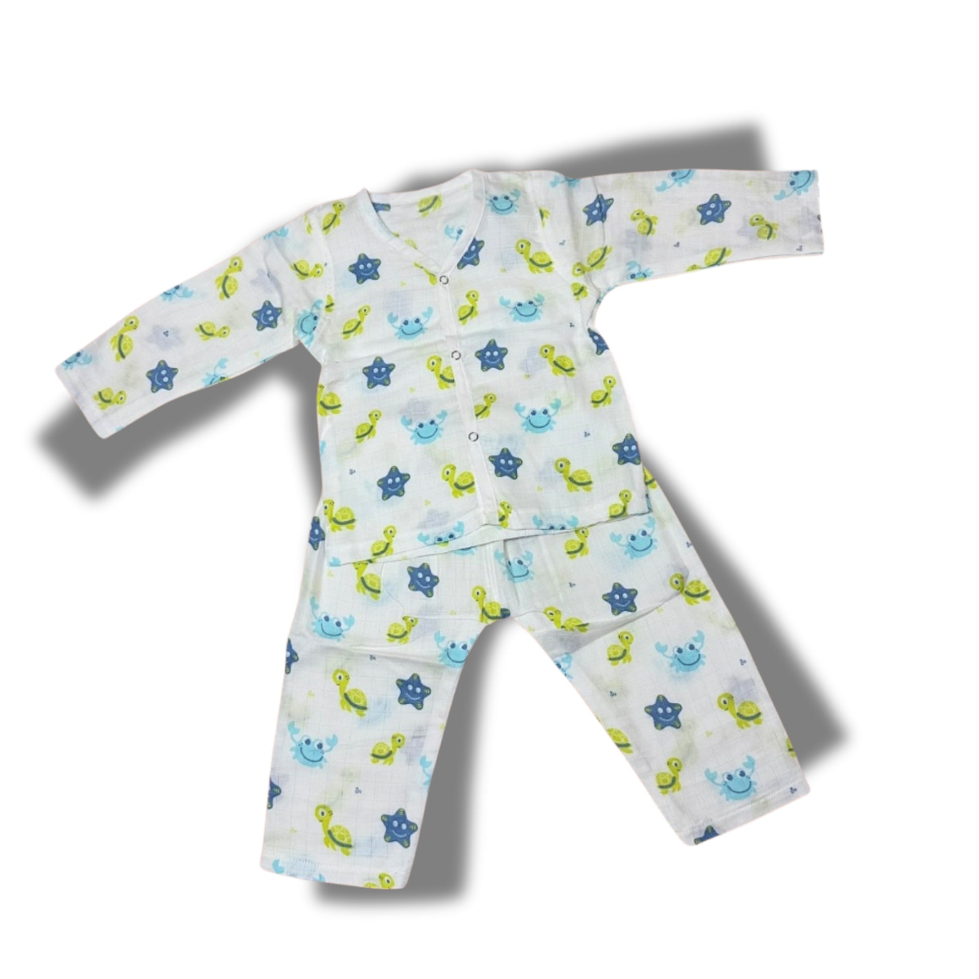 Baby Unisex Organic Cotton Muslin Full Sleeves Jhabla & Payjama Set - Size 9m-12m-Trutle Print