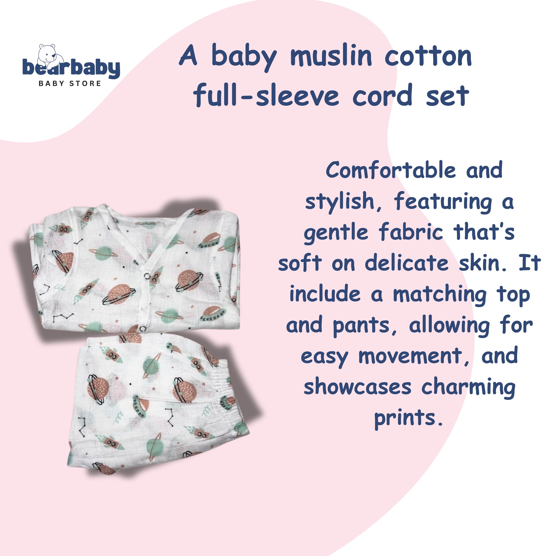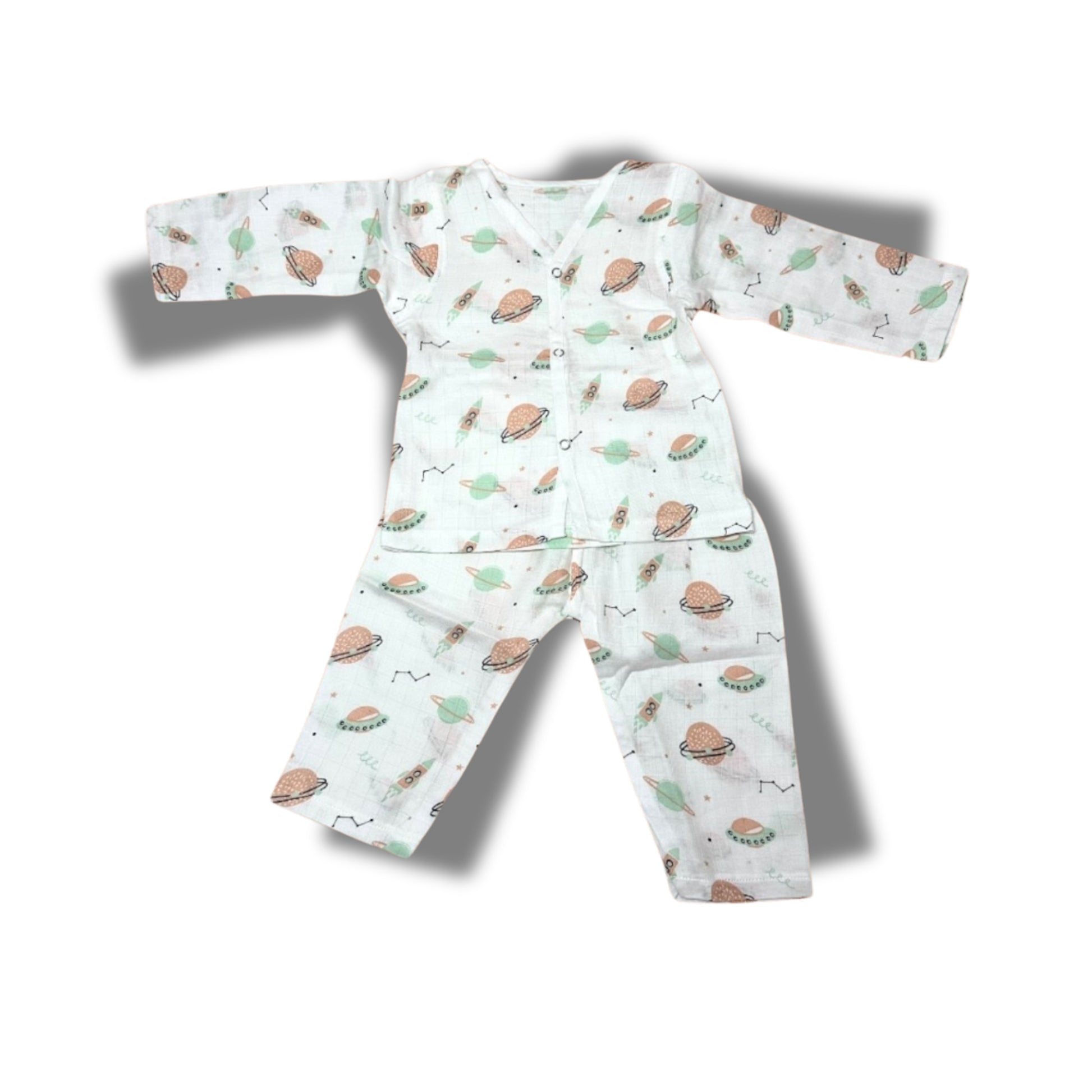 Baby Unisex Organic Cotton Muslin Full Sleeves Jhabla & Payjama Set - Size 6m-9m-Print2