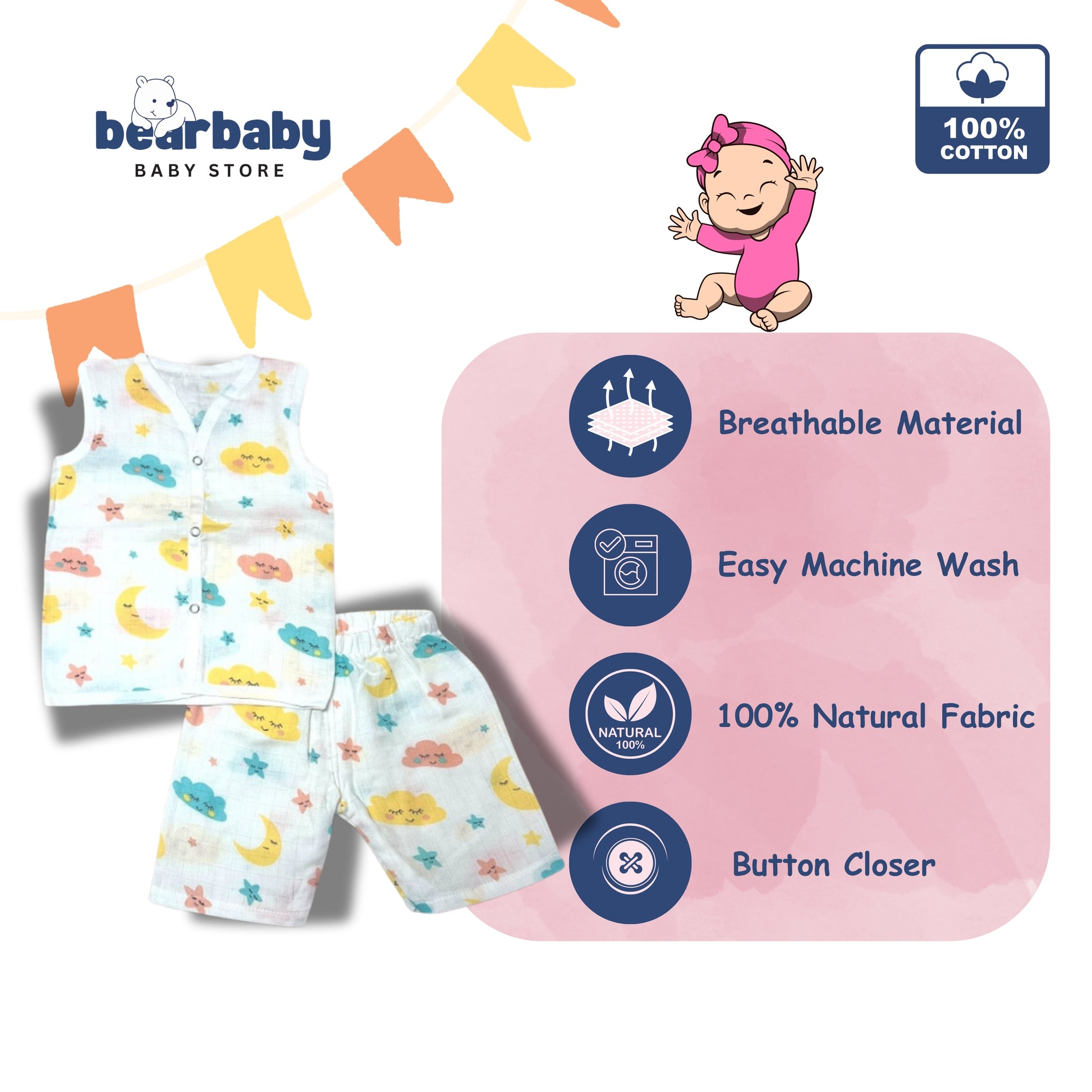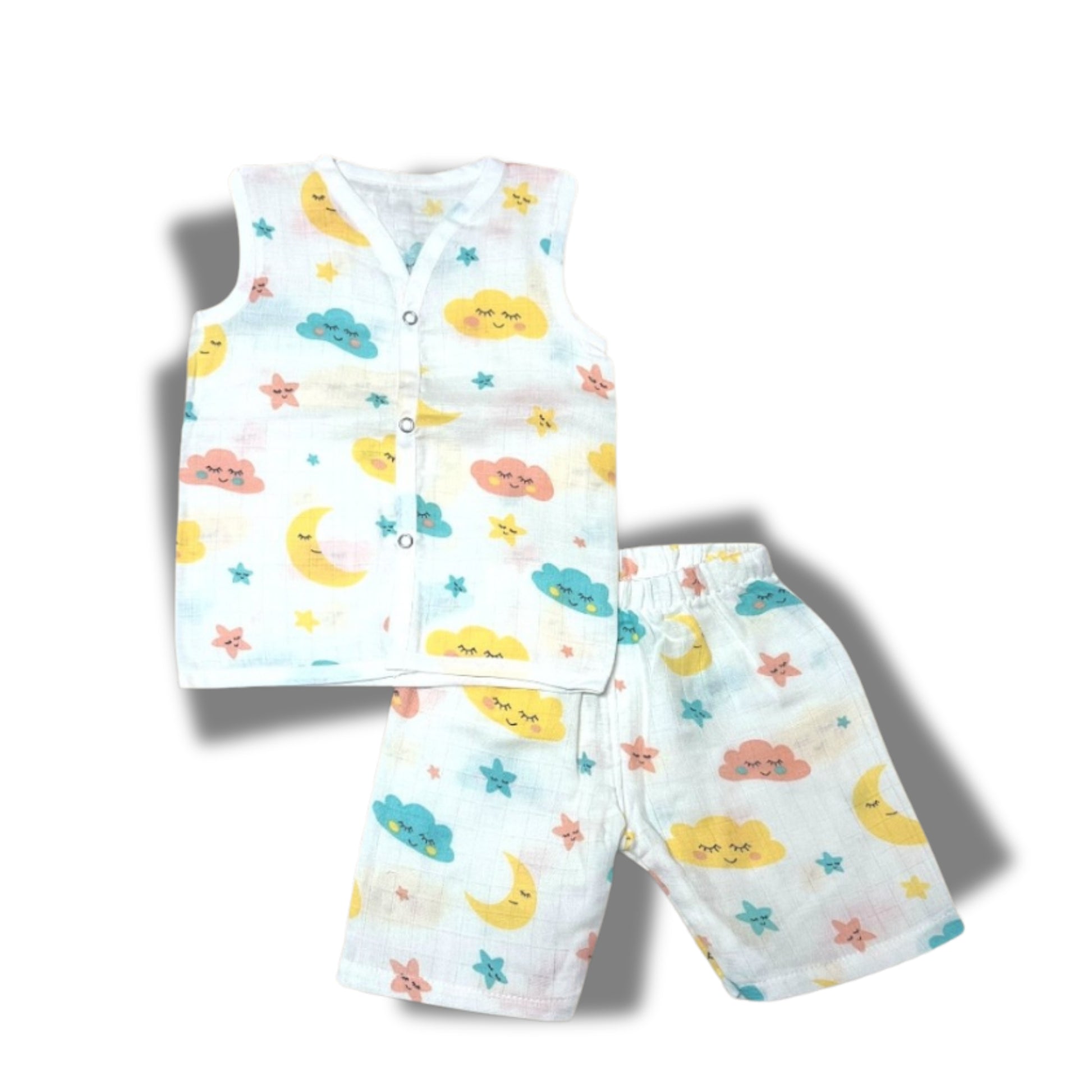 Baby Unisex Organic Cotton Muslin Sleevless Jhabla & Payjama Set - Size 3m-6m-cloud Print