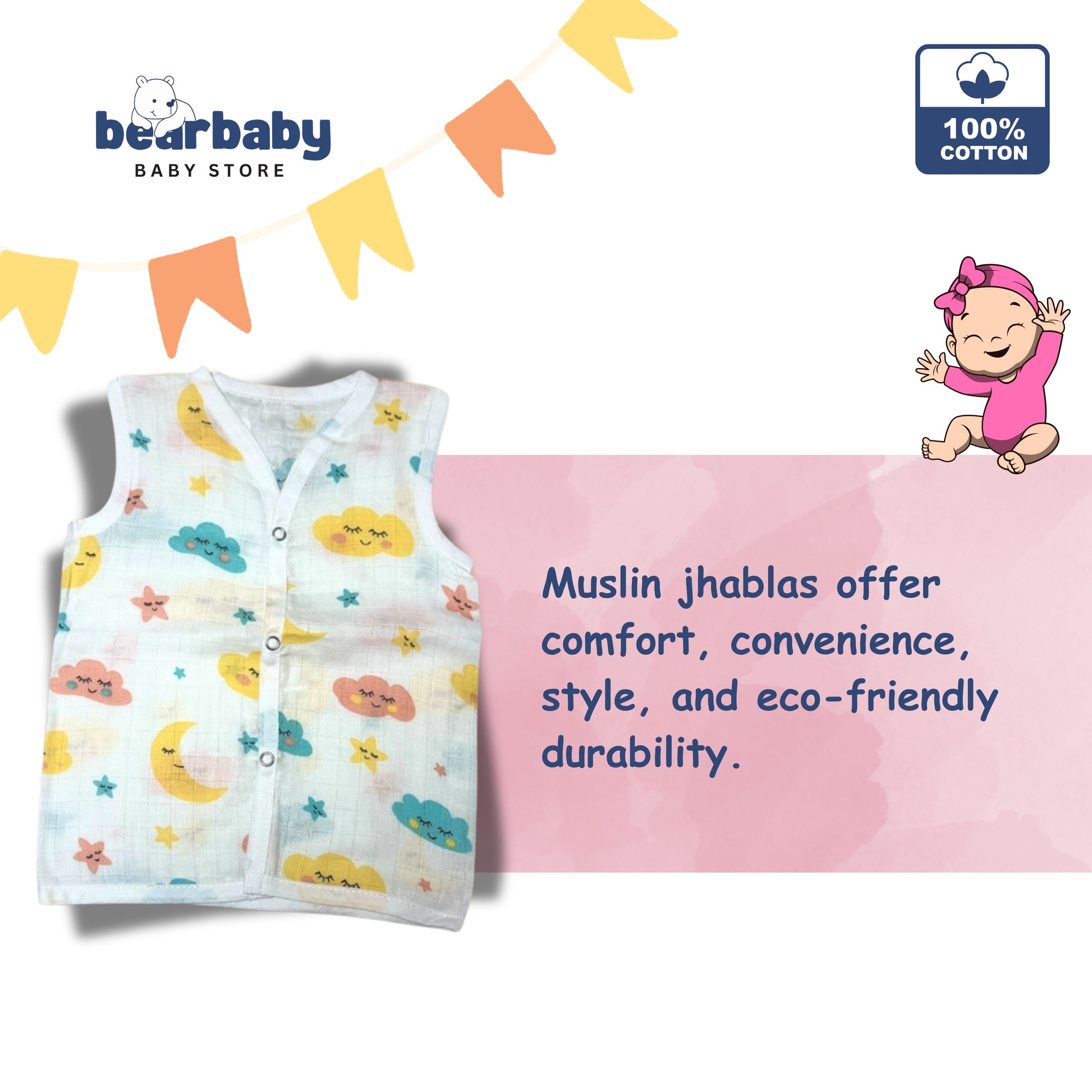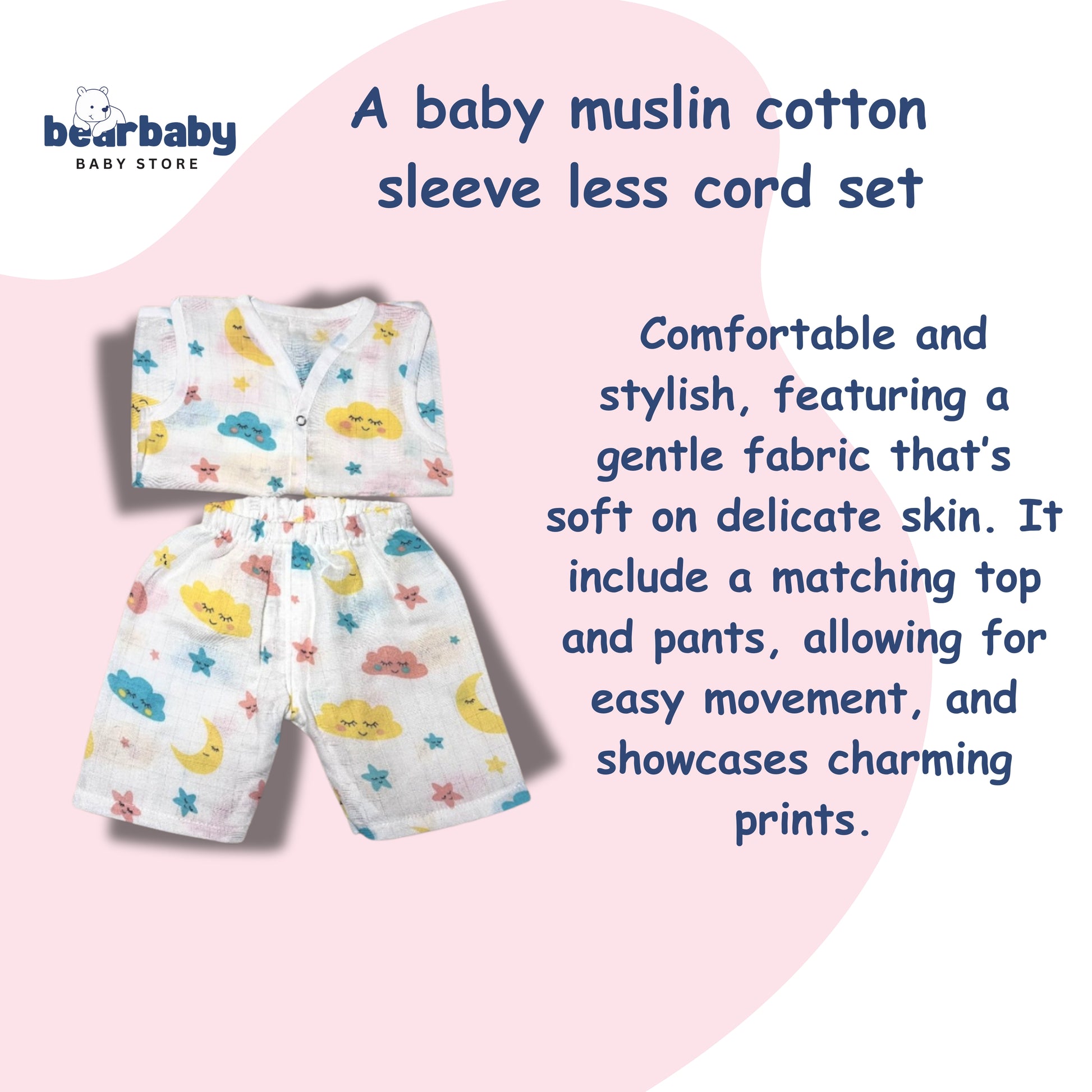 Keep your little one comfortable and stylish with our Baby Muslin Sleeveless Jhabla and Pajama Cordset, designed specifically for 0–1-year babies. Made from 100% soft, breathable muslin fabric, this lightweight set is perfect for sensitive skin and all-day comfort. Ideal for summer sleep or casual wear, the sleeveless jhabla paired with matching pajama bottoms ensures your baby stays cool, cozy, and happy. Easy to wear, gentle on the skin, and machine washable – the perfect combination of style, comfort, and convenience.