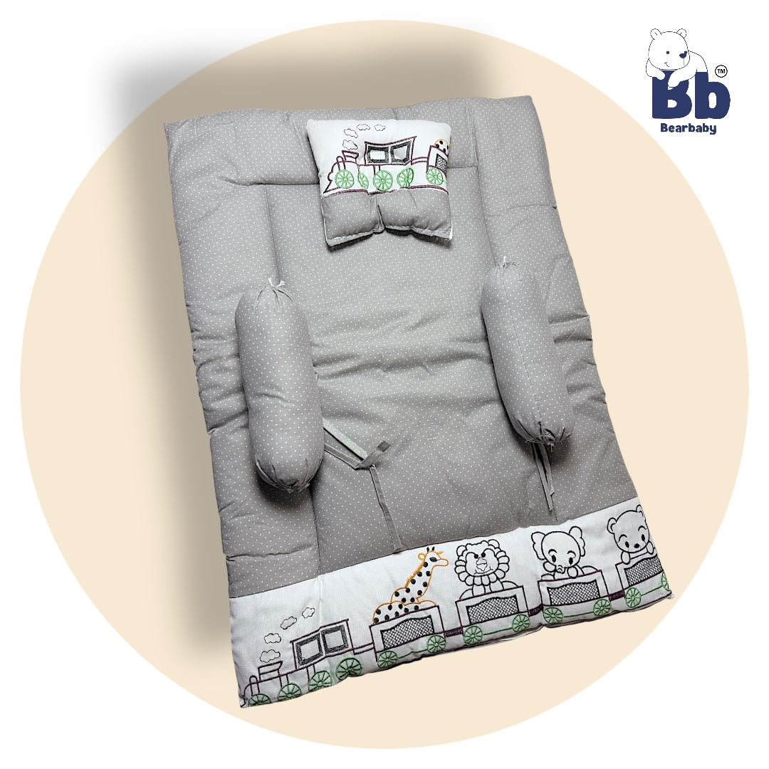 BearBaby Premium Embroidery Cotton Bedding Set | Baby Mattress with Bolster Set & Free Pillow | Soft & Washable Newborn Bedding (0–12 Months) GREY