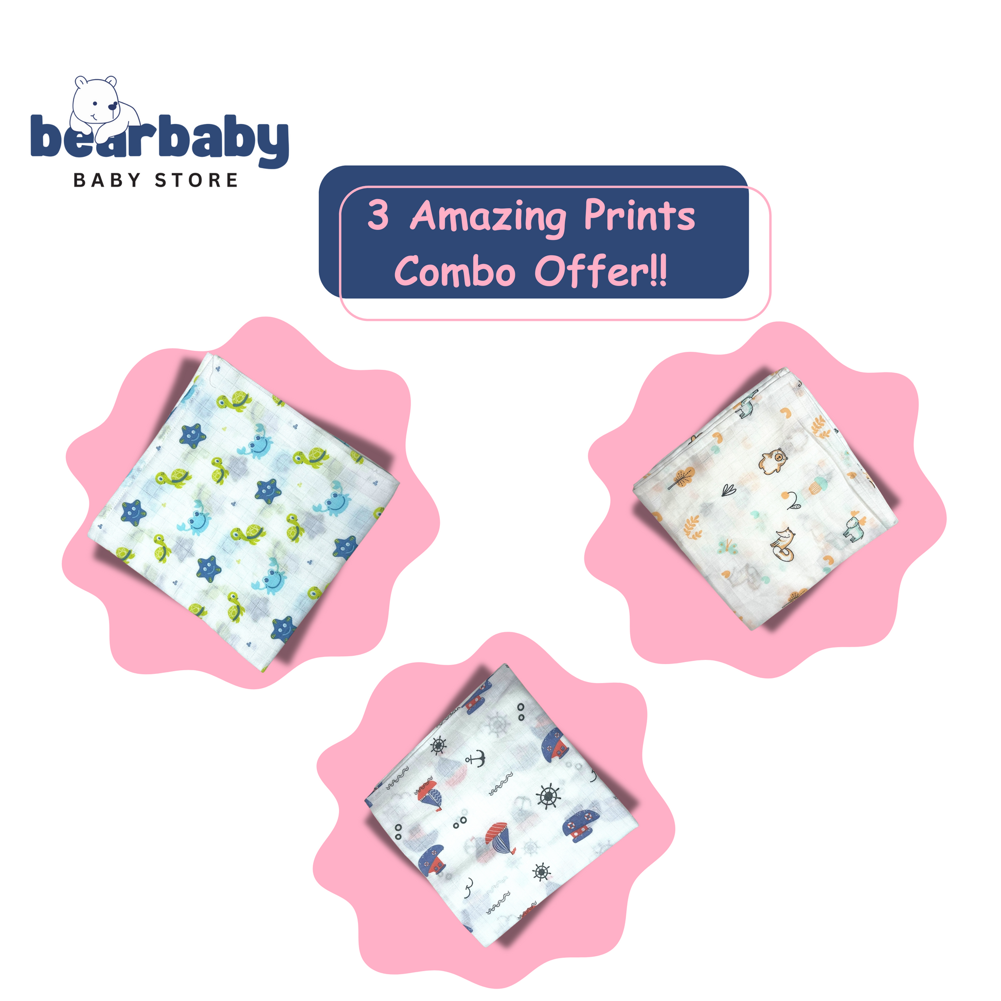 Muslin Soft Cotton Swaddle/Baby Wrapper-Size 100cm*100cm-Combo Pack of 3-Assorted Prints2