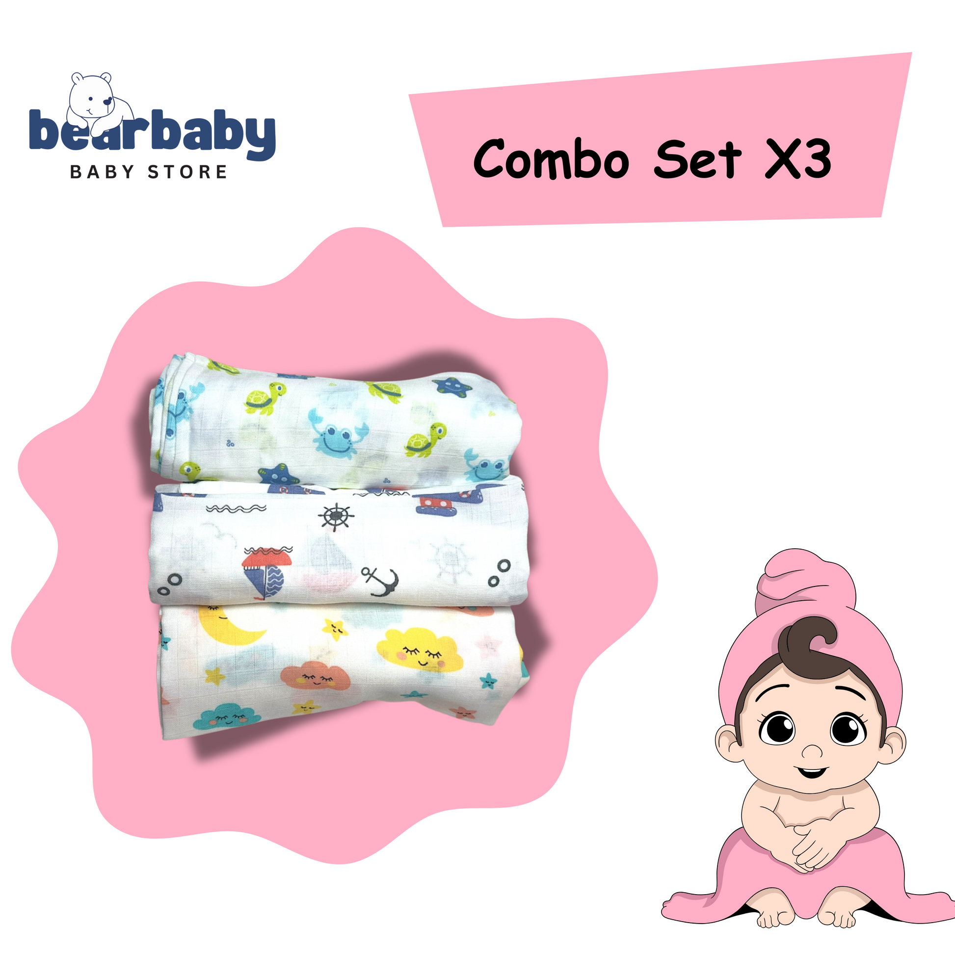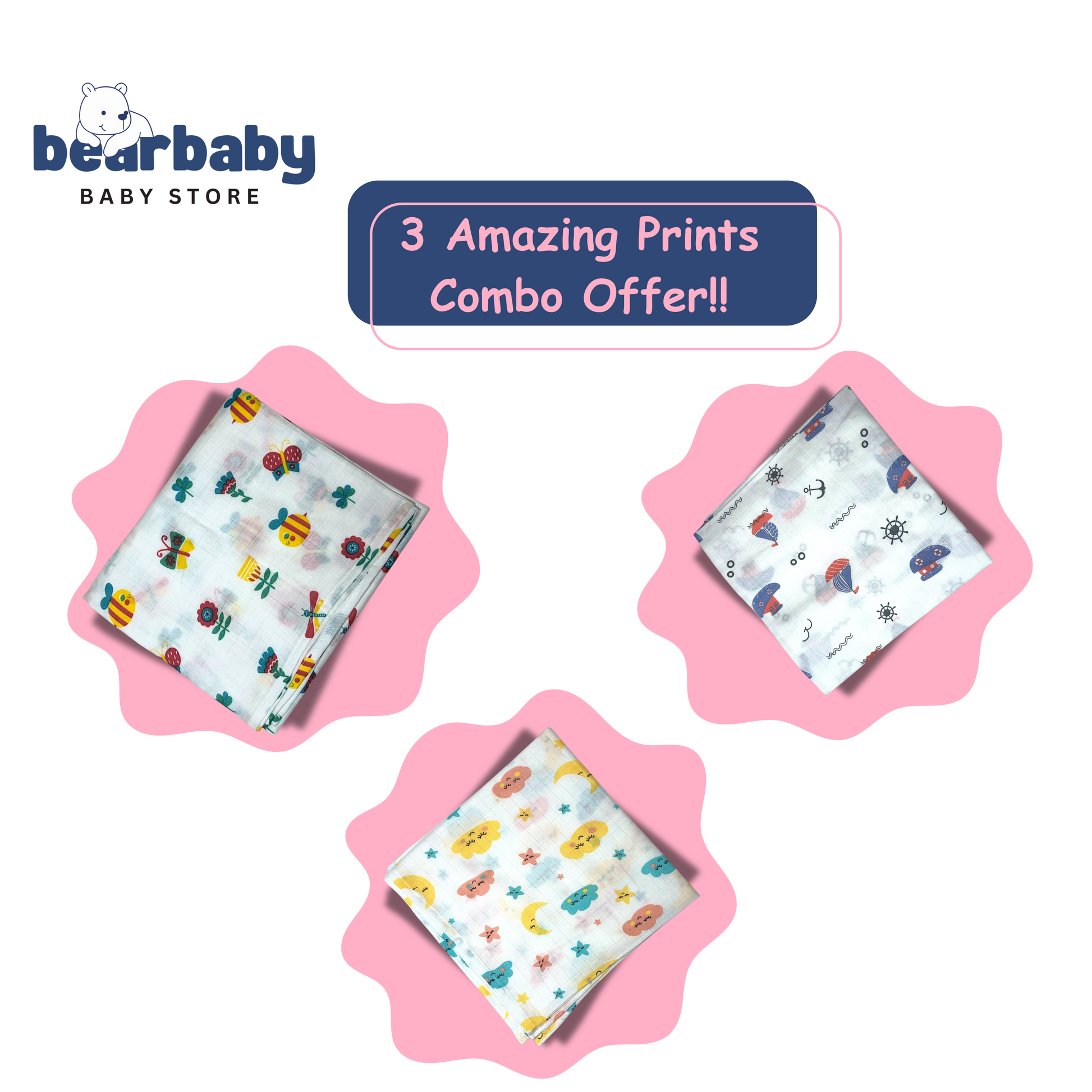 Muslin Soft Cotton Swaddle / Baby Wrapper - Size 100cm x 100cm - Combo Pack of 3 - Assorted Prints