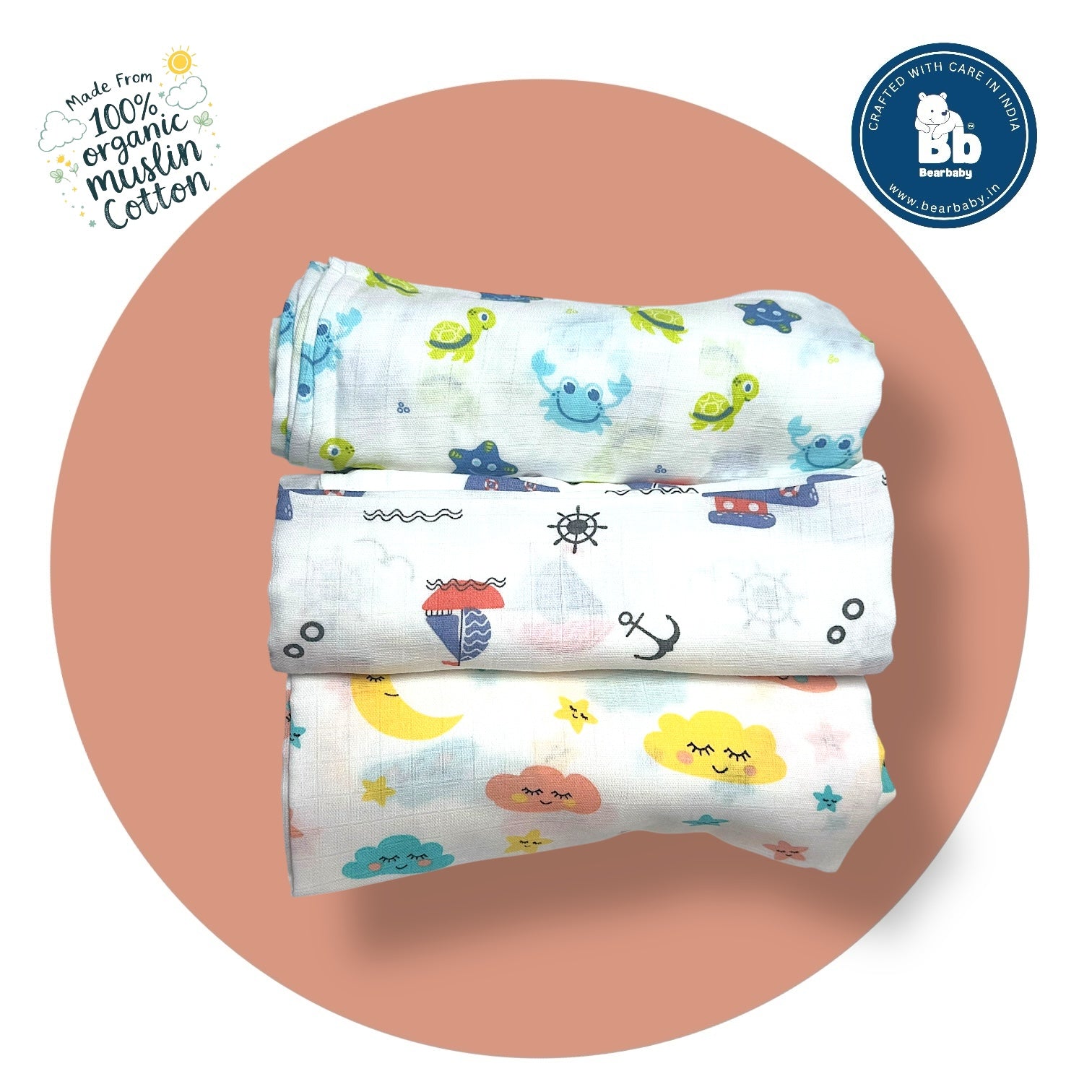 Muslin Soft Cotton Swaddle/Baby Wrapper-Size 100cm*100cm-Combo Pack of 3-Assorted Prints5